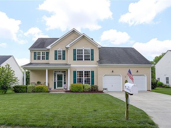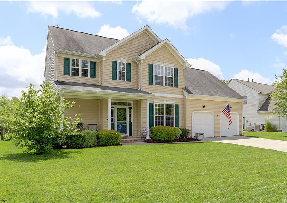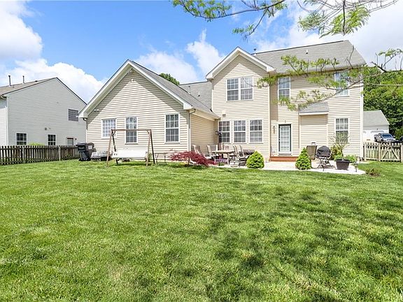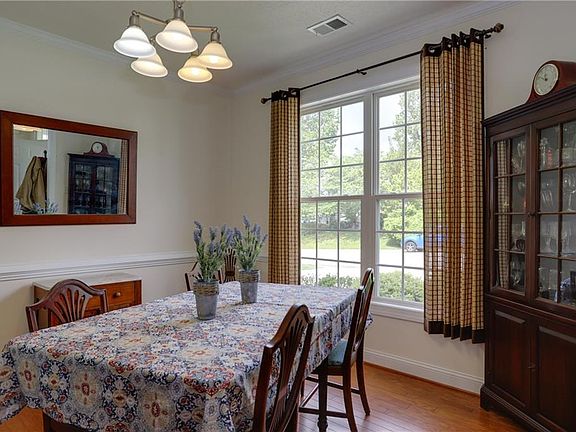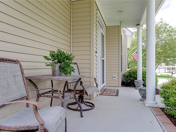 Great curb appeal with multiple angled roof peaks and inviting covered front porch. This traditional style home was built in 2005, and has been well maintained and updated. Home offers three bedrooms, including first floor master, plus second floor bonus room/4th bedroom and loft. Lot backs to the community recreation area. Entrance foyer with beautiful hardwood floors and 9' ceilings on the first floor. Two story Family room looking up to second floor loft. Display ledge on wall above fireplace. French door to beautiful stamped concrete patio and spacious fenced backyard. Large Kitchen with good cabinets and good counter space. Brushed nickel knobs and pulls. Black appliances. Breakfast area with three windows across the back. Large 1st floor Master bedroom. Large Master bath with double sink vanity, soaking tub with tile surround, and separate shower. BIG walk-in closet in bathroom with shelving. Big Loft at top of steps overlooks the Family room. Big Bonus room at end of hall.