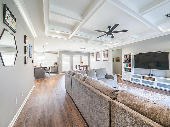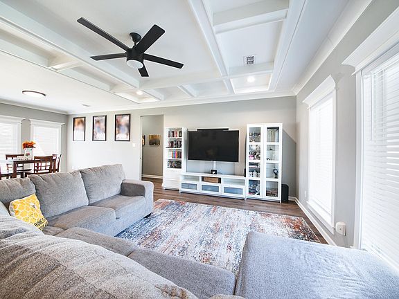 Super cute and as good as new! Open floor plan with large living area featuring coffered trey ceiling and luxury vinyl plank flooring. Tons of natural sunlight too! You'll love the kitchen with center island breakfast bar, granite countertops, a commercial style vent a hood, and pantry closet. Gorgeous ceiling treatment in the primary suite and double vanities plus a fabulous walk in shower. All 3 spare bedrooms have walk in closets too! Spacious laundry room features desk area, broom closet and tons of storage. Faux wood blinds throughout the house. Schedule your showing today!