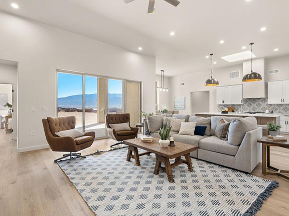 Stunning, brand new, custom construction with amazing unobstructed Sandia Mountain views on half an acre! Soaring 12 feet ceilings, warm LVT flooring & a gas fireplace welcome you as you enter the home. Living room is open to the designer kitchen with quartz countertops, solid wood cabinetry & high-end appliances. Kitchen also includes a huge island with bar seating, a spacious pantry and coffee/bar area. Primary suite is a true retreat, separate from the other bedrooms & has a spa like bathroom, huge walk-in closet & soaking tub. Large laundry room has cabinetry, quartz counters & a sink & is connected to the primary suite closet for easy access. All bedrooms have 10 foot high ceilings & are spacious in size. No carpet, TPO/metal roof, & 2 HVAC units. Back yard access & room to park RV.