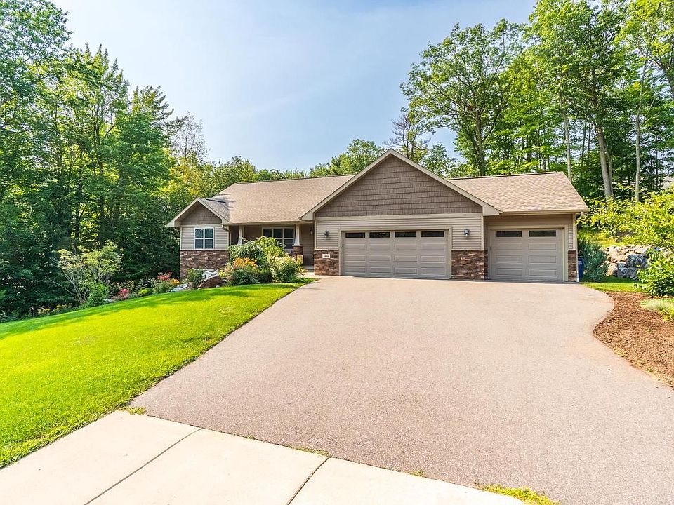 Welcome to this stunning residence where elegance meets functionality! This beautiful home features a captivating open concept design, enhanced by a grand cathedral ceiling that creates a sense of space and light. The heart of the home boasts a charming 3-way fireplace, perfect for cozy evenings or entertaining guests. Spectacular quartz counters are on the kitchen island with snack bar seating and also on the perimeter countertops between the pantry. All kitchen appliances included along with the brand new 2024 dishwasher. A reverse osmosis water filter faucet is at the kitchen sink for drinking. The dining area is very spacious with a patio door leading to the deck with modern cable railing and patio where stairs cascade to the lower-level walkout through the lush perennial landscaping past the water fountain feature and pergola. A relaxing bench and fire pit are towards the back of the yard for additional relaxation and entertaining amongst the woods.,The well-designed split bedroom floor plan ensures privacy and convenience, with a luxurious primary suite separated from the additional bedrooms. The primary suite offers A large walk-in closet and a separate bathroom with tile shower/tub combo and dual sinks with tile flooring. The laundry room offers a utility sink, cabinetry & tile flooring. Coat cubbies are just inside the home next to the 3-car garage, where you'll have plenty of room for vehicles, storage, or a workshop. A full bathroom with quartz counters and tile floor with a linen closet sits between bedroom two and three. The fourth bedroom with a modern ceiling & egress window is found in the partially finished lower level where expansion opportunities exist to create instant home equity. Space for a theater or exercise room is just off the finished family room with a walkout lower level to a concrete patio. For those who love outdoor living, the walk-out basement provides seamless access to the backyard, expanding your entertaining possibilities. Want an in-law suite? The lower level is plumbed for a 3rd bathroom and studded out with an additional unfinished area adjacent for kitchenette potential! Experience modern comfort and style in this exceptional home ? where every detail is thoughtfully crafted for a lifestyle of ease and enjoyment complete with a General generator and owned water softener. This won?t last long in Wausau West Schools with Stettin elementary!