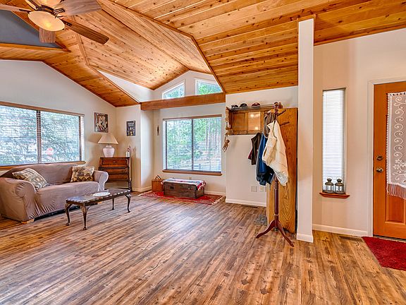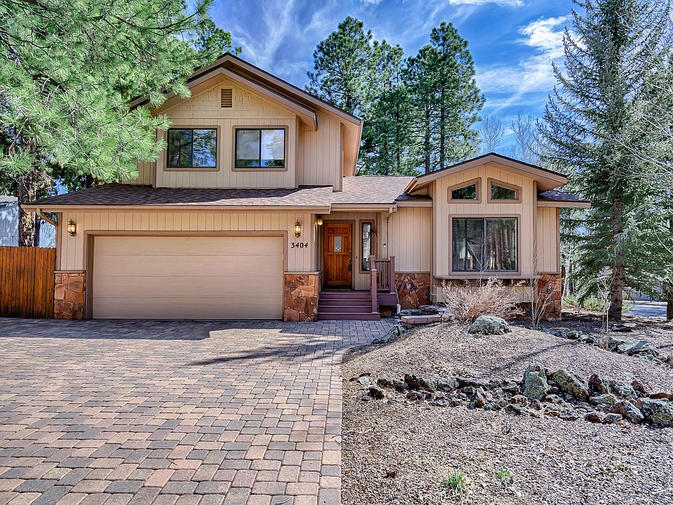 Step on up and feel right at home in this beautifully updated University Heights Gem!Experience the Flagstaff life beneath the towering ponderosa pines and white aspen trees while nesting inside with tongue & groove ceilings, an open great room, beautifully appointed kitchen, and cozy second living area with a pellet stove. Move right in and not have to worry about making repairs or remodeling for a long time! This has new carpet, a new roof, newer furnace, fully remodeled kitchen with granite counters and stainless steel appliances, luxury vinyl plank flooring, cultured marble in the bathrooms, new skylights, half bathroom downstairs, new Trex decking outside, and a whole lot of character! Outside you will enjoy a good sized fenced yard, two deck areas for enjoying the amazing spring