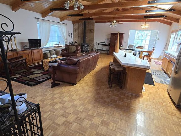 This custom-built 2-bedroom, 2-bath home sits on over half an acre and is thoughtfully designed for comfort and entertaining. The open floor plan creates an inviting atmosphere, complemented by a wood-burning stove that adds warmth and charm. The spacious kitchen features ample counter space and a large island-ideal for gathering with family and friends. The primary bedroom easily accommodates full-sized furnishings, while the primary bath offers both a walk-in shower and a soaking tub. A cellar provides additional flexible space suitable for hobbies, storage, or a workshop. Outdoors, a four-car garage offers abundant room for vehicles, recreational equipment, or toys, with additional storage sheds located throughout the property. An enclosed garden area is ready for your green thumb, and a koi pond awaits restoration to become a peaceful focal point. Located in the desirable Kern River Valley, this property offers space, functionality, and the opportunity to enjoy mountain living. Sch