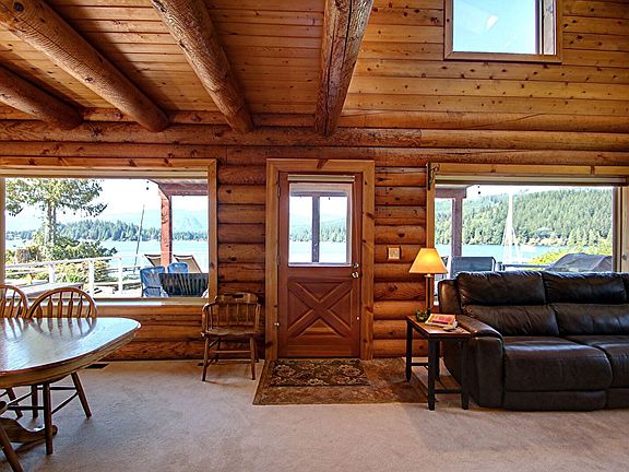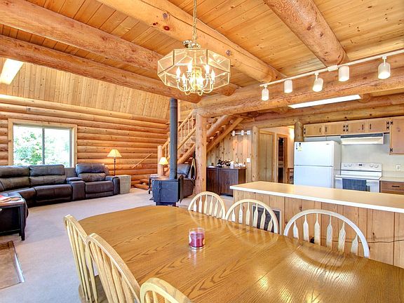 Escape from the city with a lakefront vacation retreat on Lake Cavanaugh. This distinctive log home features an open living/dining/kitchen with dramatic lake views, new party size deck w/hot tub, private dock w/boat lift. Main floor has master, bath, laundry, pantry. Upper level has 2 bdrms, bath, loft rec room w/deck overlooking the lake. Detached garage w/1 bdrm bunkhouse & bath makes it easy to sleep 14-16. Circular driveway w/covered entrance to home, lots of parking.