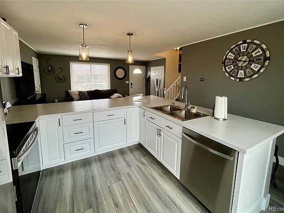 Entertainers dream kitchen, open floor plan, to back patio with large fenced backyard on corner lot. New appliances, new cabinets in kitchen and baths, engineered quartz counters, new lighting, newer carpet and laminate wood floors throughout, newer furnace and ac (2 years), new front landscaping. Primary bedroom with walk-in closet, 3 bedrooms with additional bonus/ office/ guest space that could be easily converted to 4th bedroom. Attached two car garage with built-in storage and backyard access. Additional storage in unfinished basement. Newly installed RV/ boat parking for additional off-street parking.