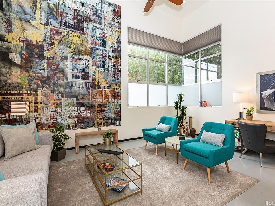 Chic urban loft with a DRASTIC price reduction. Soaring 15' ceiling, gas fireplace, small 12-unit compound. Corner unit with fresh air entry from lovely grounds for those who prefer not to navigate hallways. OPEN plan conducive to today's life style,. Finishes echo the industrial ambiance of the neighborhood with a concrete floor, metal staircase. At 982 sq ft, this spacious 1BD/1BA loft comes with an in-unit washer/dryer, one car garage parking. Up to two pets are permitted, not to exceed 40 lbs each, and dues are a very user friendly $390/m. The grounds have an outdoor eating and seating area, even a dog run. Near Emery-Go-Round, which whisks commuters to McArthur BART.