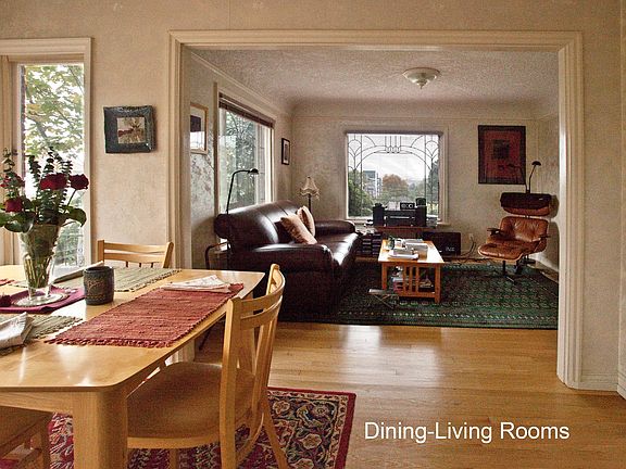ENGLISH BRICK TRIPLEX WITH HISTORIC DETAILS & STUNNING VIEWS OF DOWNTOWN & RIVER leaded glass windows, crown molding, coved ceilings, hardwood floors, wool carpet & ceramic tile detail. built to be a home business, with private and public areas as well as large basement storage. Family Room (or public business area) with separate entrance, fireplace, office area with leaded glass windows can be a second bedroom. master bedroom, walk-in closet, 2 Lavatory & toilet areas, large shower with seat & window kitchen with custom ceramic tile, microwave, dishwasher, disposal plus washer/dryer storage area for bikes at back door, sweet little deck hidden in the trees rent includes hot water, sewer, garbage, plus 2 private parking spaces OPEN HOUSE BETWEEN 11:00 AND 2:00 MONDAY, AUGUST 15 Rent includes: water/sewer, hot water, garbage and 2 parking spaces Renter pays for: electricity, cable, internet No Smoking