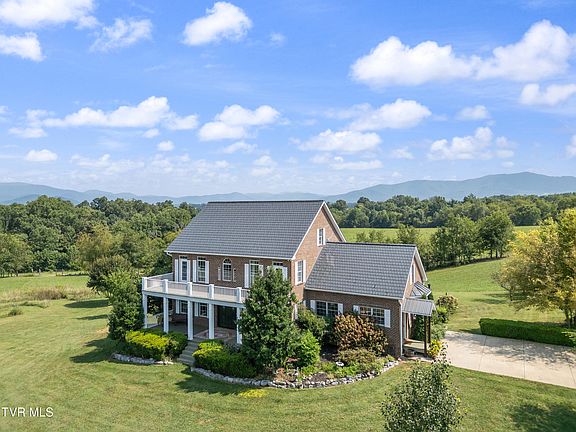 Discover an incredible home with breathtaking mountain views and unmatched privacy on 5.08 acres. This residence boasts four bedrooms, four and a half bathrooms, a spacious detached garage and workshop, and a 40-foot swimming pool complemented by three expansive porches. Ideal for those seeking an established yard, garden, orchards, and ample garden space. The home features one-level living with the primary bedroom on the main floor, complete with French doors opening to a 60-foot porch. The primary bathroom includes a walk-in shower and a freestanding tub.The living room and kitchen share an open concept design, leading out to the covered back porch through double doors. A separate dining room and large foyer complete the main level. Upstairs, there are three bedrooms, two of which have en-suite full bathrooms, and a sizable bonus room. Two bedrooms provide access to an upper deck, offering stunning country views. The home is also designed to accommodate separate living quarters. The basement includes a bonus room with a built-in aquarium facing the living area, a den with a bar and large closets, a full bathroom, and an additional kitchen. Reclaimed wood accents the bonus room, bathroom, and bar area, while the closet features doors from an old barn stable. The basement also has a garage space and door, as well as an exit leading to the pool area. The L-shaped pool is perfect for entertaining, surrounded by five acres of serene farmland. Nearly every room in the house offers incredible mountain vistas. For those who adore porches and outdoor living, the home provides various porches to enjoy the natural surroundings. The property includes three orchards with fruit trees at different maturity stages, including apples, peaches, pears, crab apples, and figs. A large area is dedicated to Catawba and Concord grapes. The 40x60 shop is equipped with two garage doors and a large RV door with RV electric hookup. This home truly embodies the essence of country living