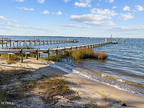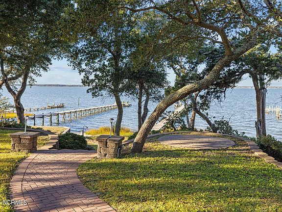 This 3 BR , 3 & 1/2 bath gem is situated perfectly, nestled among maritime oaks for a shady and picturesque yard that leads down to a sandy beach area and onto the dock with boatlift and jet ski lift for your water activities. Beautifully landscaped yard with bricked walkways, picnic patio, curved steps and retaining wall at waterside, a great place to relax and enjoy the expansive Bogue Sound water views!