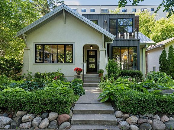 Stylish 2016 remodel of a city-lakes bungalow into an open-plan, light-filled, modern home reflecting a master architect's amazing creativity. Great spaces, custom cabinetry, high-end appliances, and beautiful finishes. Two dormers and a bay expanded the home. The kitchen and baths are design at its best. New roof, windows, mechanicals, insulation, 2-car garage with a car charger, driveway and exterior doors. The main level has living room with fireplace, dining room, kitchen, full bath, bedroom with a Murphy bed, covered deck with gas hook-up. The upper level is a flex space currently used as a primary suite with sleeping area, full bath, walk-in closet, laundry, office (could be a separate bedroom), and balcony. The lower level has a bedroom with 3/4 bath, a 2nd laundry, and ample storage. The home was designed to accommodate an elevator. Wonderful location-a short walk to lake Bde Make Ska, local shopping and restaurants. Lovely gardens. This home is move-in ready and a must see.