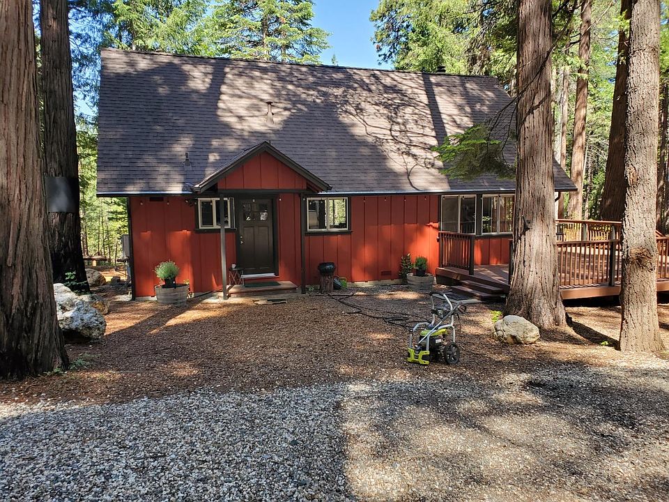 Beautiful mountain home sold furnished. Warm, rustic exposed wood interior. Central heat and air conditioning. Oversized deck. Finished garage/workshop. Multiple out buildings. Tons of parking. Exquisite landscaping on 1.9+/- acres featuring beautiful towering cedar and white fir trees. Community pool too!