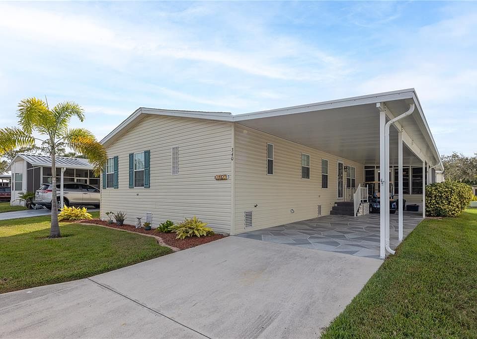 This immaculately kept 3 bedroom home in a very active 55+ co-op community could be yours forever if you act quickly. No lot rent here and very low HOA dues of $211 per month which include water and trash pickup. This is a beautifully appointed home and comes with all the high quality furnishings you see and a roof that was installed in 2016 and the A/C in 2018. You would only need to add your personal touches and then sit back and enjoy! Upon entering this beautifully maintained home you fall in love the open floor plan. It boasts generously size rooms that will allow for hosting family or friend get togethers with plenty of room to spread out. The split floor plan affords for privacy to all when guests are visiting over night. The lanai is enclosed with vinyl windows for additional living space. Inside is where you will find the utility closet that houses the washer and dryer as well as additional storage space. There is no need to carry laundry up and down steps here. The kitchen boasts a super sized island with room for bar stools and is open to the dining and family rooms. As you enter the large main suite, you will notice the extra large walk-in closet along with the very generous sized bathroom. Your own personal oasis! The additional bedrooms and bath are located off the family room in the back area of the home and are large as well. Enjoy a ride around the airport in the included golf cart and mingle with the other residents. Or you may decide to take a dip in one of the 2 heated pools or get together in one of the club houses for a friendly card game. This community has many scheduled activities you may decide to partake in such as pickleball, horseshoes or shuffle board. Just to name a few. The location adds to the appeal of this park as it is a short 2 miles to I75 for ease of airport runs, shopping or the beach. Shopping and restaurants are abundant in this area with more coming in all the time!