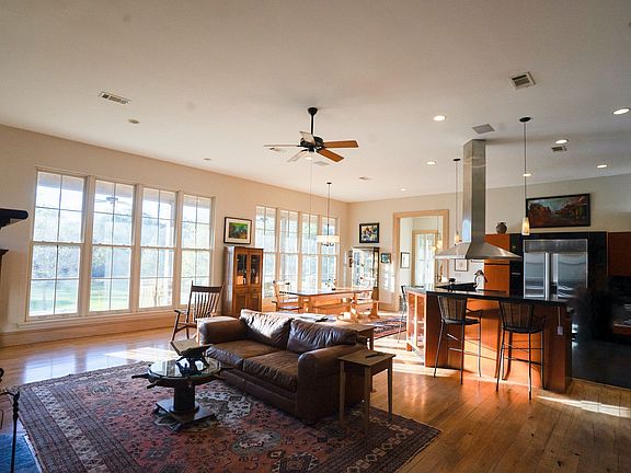 PRICE REDUCED!! This AMAZING, UNIQUE, one-of-a-kind property will truly wow you! The beautiful contemporary farmhouse is secluded near the back of the gorgeous land. The drive-in, which is well over ¼ mile from the county road, is as peaceful and as pretty as it gets. The description of this country home is lengthy but well deserved. There are 12-foot-deep wrap porches made of amazon cedar all the way around the home! Inside the home, you will find a welcoming open plan for the kitchen/living/dining area with persimmon hardwood floors. Light floods the area with 10' windows with gorgeous views of the meadow-like front yard! A wood-burning fireplace framed in Chinese slate with an amazon cedar mantel is flanked with built-ins and an entertainment center. French doors on either side of this area overlook the barn and pasture area. The kitchen features a modern bar separating it from the dining and living areas. The bar contains a built-in glass front crystal display case. Pendant lights over the bar highlight the Viking stove. The cabinets and drawers are German Simatic. The kitchen features a Subzero refrigerator, a bar sink and double sinks with an added nook for charging devices and storage. The spacious master suite is 18' x 30' with persimmon hardwood floors, a gas log fireplace surrounded by Chinese slate, a 16' black walnut mantel with built-ins underneath and a verdigris copper flue. The master suite is flooded with natural light and overlooks the sunny meadow-like front yard and dappled shaded back yard. The large walk-in closet in the master suite is accessible from both sides of the bedroom and has beautiful built-in dressers and wardrobes, plenty of hanging space and persimmon floors. The master bath is also accessible from both sides of the bedroom. It has double hammered copper sinks set in polished granite, copper barware faucets, amazon cedar cabinets under sinks and vanity with granite top, large tub with telephone style hand fixture, black tile shower with geometric glass block enclosure, Chinese slate flooring, antique heart pine door to water closet with bidet surrounded by geometric glass block allowing light and privacy. Just outside the master suite is a cypress screened sleeping porch with a custom-made cypress queen-sized hanging bed and artisan wall sconces on either side of the hanging bed. The welcoming foyer is 15' x 12' with Chinese slate floors, artisan-made pendant light chandelier. The foyer opens to a library/study via 8' wide double antique pocket doors made of heart pine with original hardware. This magnificent study has black walnut paneling with glass front bookcases and bookshelves all the way to the ceiling. Insets in bookshelves can accommodate 2 desks or a desk and sofa. Antique heart pine doors with beveled glass provide access to the back porch and patio. The guest suite has an antique heart pine pocket door in the interior hallway allowing for guest privacy. There are persimmon floors in this room with antique heart pine doors to the bedroom and bath. The bath has Chinese slate flooring and a hammered nickel sink set in granite. The guest suite has access to the back porch through French doors and views of the side yard and pasture through 10' windows. There is a Katrina cottage with one bedroom, living area, kitchen and full bath. A peaceful screened gazebo is behind the cottage. The exterior home materials include authentic stucco, Arkansas field stone curtain walls, staircases, outdoor fireplace, and chimney. The roof is standing seam metal. There are custom copper gas lanterns on both sides of the front and back doors. The front porch has 1'x1'x12' cypress columns with beveled edges', amazon cedar floors. A recirculating "live" creek winds throughout the backyard. A wood deck and bar overlook the koi pond which is below the porch of the master suite. Nature abounds throughout the backyard and entire property. There is a 4-stall, cypress board and batten, horse barn with clerestory, feed room and tack storage room, and run-in shed in the paddock area. Outbuildings include a small storage barn, one small equipment shed, one large equipment shed, two 12'x12' horse barns with 12'x12' turnouts. The stalls have mats, lights, and water. There is also a 90'x180' riding arena.