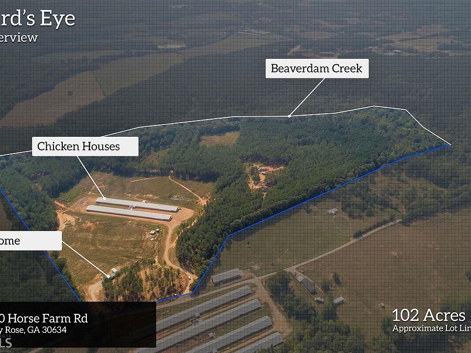 Two State of the Art Layer Houses. Built in 2017 - 40 x 500-Concrete floors and metal braces made for trusses. Complete LED lighting, storage room inside house #2..too many extras to list. 102 acres, entire left and back of property line is Beaverdam Creek. Remodeled Single Wide mobile home with additional septic and water. 3 bedroom 2 bath Large kitchen with island, large master with walk in closet and dressing area with separate sink Water system -above ground sand tanks that filters water. Several fields cleared for hunting or gardening. Partial area cleared to build 2 more chicken houses 2 wells on the property