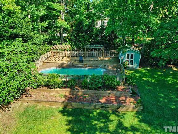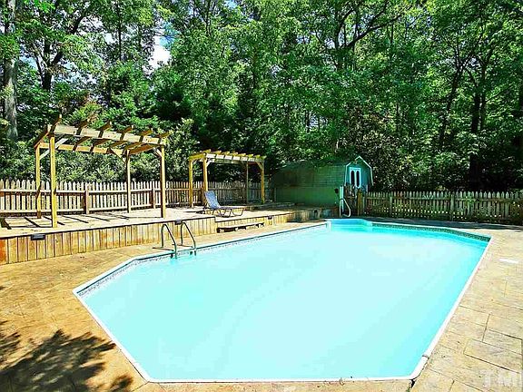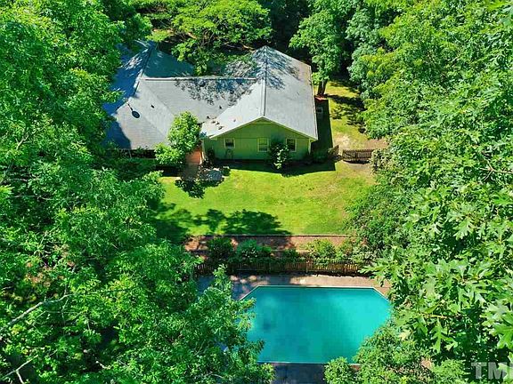 Desirable Ranch situated on a cul-de-sac in north Raleigh's Black Horse Run. This 4 bedroom home sits on a private, wooded acre lot with a sparkling pool. Vaulted ceilings in the family room, a formal dining room, breakfast nook, and flex room give an abundance of space. Enjoy fresh produce from the blueberry bush, fig tree, and raised garden beds. The shed doubles as a chicken coop. Hardwoods were just refinished. Rinnai water heater 1 y/o. Newer kitchen appliances.