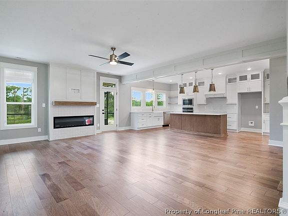 Gorgeous Home in Swans Creek featuring 5 bedrooms and 4 baths, Beautiful entry with Formal Dining room, Nice open floor plan with hardwood flooring throughout downstairs, Kitchen has Dove White cabinets with soft close drawers, quartz countertops, tile backsplash, stainless wall oven and microwave, cooktop and large island that opens up to the great room, Electric fireplace with tile surround and shiplap, Pantry, Laundry room downstairs, Bathrooms have Honey Wheat cabinetry, tile flooring and quartz counter tops, Master Bedroom with sitting area is downstairs, Master bath has Dual vanity, Separate tile shower and garden tub with tile surround, Large walk-in closet, Additional bedroom and full bath downstairs for guests, Upstairs features 3 bedrooms, 2 full baths and Large Flex Space, Sodded yard with irrigation system, Covered Front Porch, Screened in Back Porch with beadboard ceiling, Security System, Easy access to HWY 87 and I-95, Whole house Water Filtration System Included
