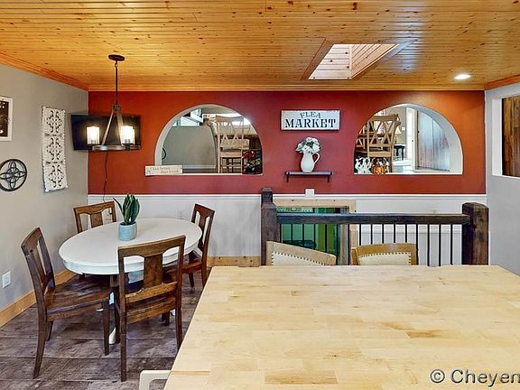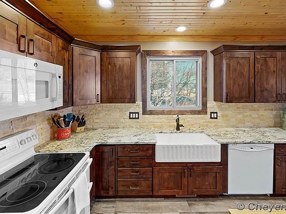 Main floor incorporates a welcoming walk-in area with a bay window and drop down living room. Granite countertops, dark stain soft close cabinets, skylights, farmhouse sink, butcher block island, double oven, eat-in kitchen + casual dining room with arch window cut outs . Cozy up in the sunroom with pellet stove heat to keep you warm and cozy on these cold winter days. Master bedroom offers an immense amount of space with a sunken tub in the master bath w/ his and hers closets.