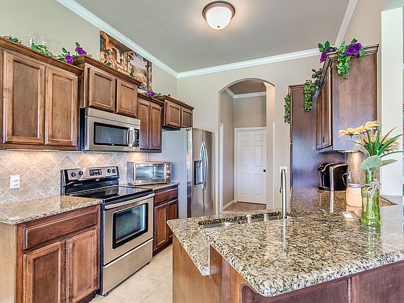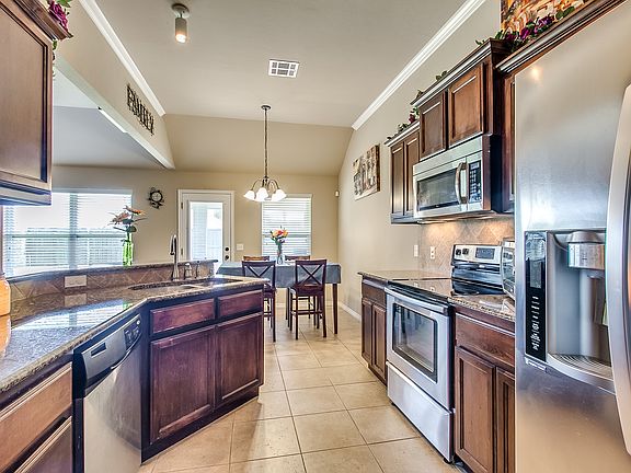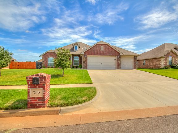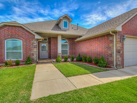 Beautiful home in Mustang School District! Great Community with easy access to I40, Kilpatrick Turnpike, restaurants and shopping. Open kitchen/living/dining design, includes 3 bedrooms plus 4th room that can be used as an office or 4th bedroom if needed. Kitchen has granite countertops, lighting under the cabinets, new stainless steel appliances (GAS STOVE), new kitchen faucet with indicator light for hot or cold water, kitchen has a ton of cabinets with separate pantry. Spacious master suite includes large walk-in closet with garden tub, separate shower, and a double vanity. New beautiful wood floors throughout home. New carpet. Large underground shelter in your 3 car garage. Outside large covered porch and a covered patio in the backyard with a portable fireplace. Large shed for easy storage. New fence on backside of yard. Quite neighborhood with playground right down the street. Walking trails. Come and see this beautiful home today!