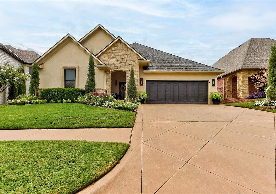 Tucked inside the gated golf course community of Rose Creek, this one level floor plan welcomes you with an open concept layout featuring three spacious bedrooms and two bathrooms. The kitchen features two pantries, double ovens, gas stovetop, a large island and bar area. All bedrooms have vaulted ceilings and spacious closets. Front secondary bedroom has a built-in Murphy bed. New roof and interior paint in 2020. Recent updates include new stove, sink, fan, light fixtures, fence, sod, French drains, landscaping, and HVAC. Don't miss the amazing retractable roof in the backyard! Rose Creek is a perfectly located Edmond community that includes 24/7 security as well as a one-of-kind pool, park, and fitness center.