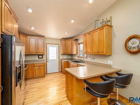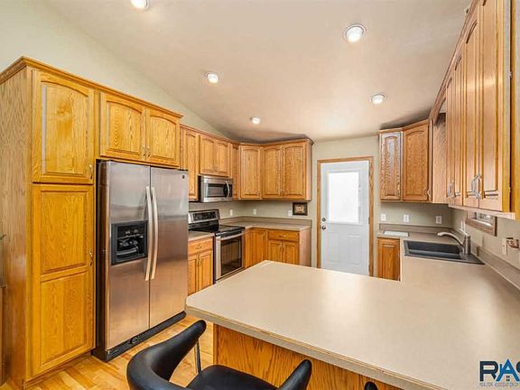 This 4 bed 3 full bath SE Sioux Falls gem is ready for you! The spacious living room features new carpet, bay window that lets in tons of natural light & room for plenty of furniture. It flows nicely into the ample dining room & well-appointed kitchen w/door to the deck, hardwood flooring, stainless appliances, vaulted ceiling, plenty of cabinets & counter space including breakfast bar. The main floor master bedroom with walk in closet & en suite full bath easily handles your king size bedroom furniture. Another great sized bedroom & full bath round out the main level. The massive lower level family room has plenty of room for a game table, exercise equipment or bar in addition to being a great space to cozy up to the fireplace. Even the utility/laundry room is big in this home! The 3rd & 4th bedroom & another full bathroom complete the lower level. Fantastic large fenced lot for pups and yard games! Recent updates include, some carpeting, new overhead garage door & a huge parking pad!