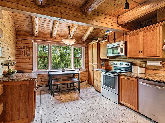 This adorable and move-in ready home sits on over 10 acres on the Lyndonville and St. Johnsbury line. With its lovely log exterior and welcoming front porch, this home is bursting with charm! Inside, the log walls add character to the space, creating a warm and rustic feel throughout. The heart of the home is the beautiful eat-in kitchen with cherry cabinets, granite countertops, stainless steel appliances and a moveable island that adds additional storage and functionality to the space! The kitchen flows effortlessly into the spacious and cozy living room featuring a wood stove - perfect for keeping warm on cold winter days, hardwood floors and plenty of windows to allow the sunlight to shine in. Completing the main level is the full bathroom along with access to the front porch and backyard. Upstairs, two nicely sized bedrooms boast wood ceilings and offer plenty of closet space. In the walkout lower level you’ll find the mudroom and laundry areas as well as additional space for storage as well as the potential for further finishing if desired. Outside, a mix of wooded and open acreage ensures there is space for all your outdoor needs and the level side yard is perfect for gardening and can easily be fenced in! Great location with VAST Trails nearby and only minutes to Lyndonville with its great shops and restaurants. Plus Burke Mountain, the Kingdom Trails and New Hampshire are all convenient to get to with easy access to I-91, I-93 and US-2.