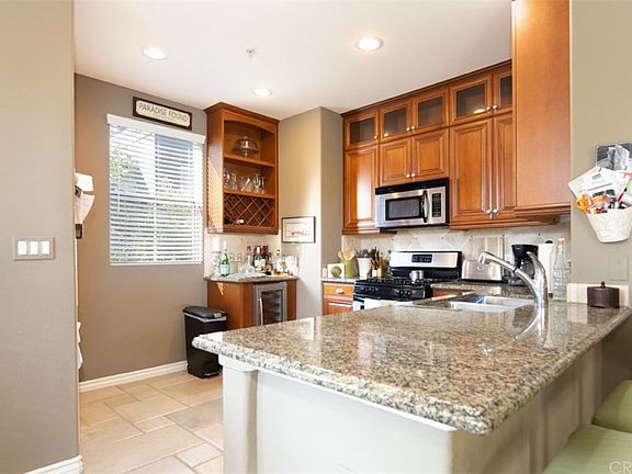 Located on the top level of Irvine's luxe Watermarke complex, this 2 bedroom, 2 bath condo impresses with breathtaking amenities and large windows. The functional floor plan is designed with one bedroom on each wing for ultimate privacy. The spacious and airy great room centers around a gourmet kitchen with stainless steel appliances and granite counters. Substantial windows drench the interiors in natural light and a private deck offers additional entertaining space with views of the beautifully manicured grounds and resort style pool. The master bedroom features an ensuite bath while the guest suite can double as an office with exceptional built-in cabinetry. The breakfast nook extends to the exterior deck where you can barbecue overlooking the palm trees and grand pool area. Incredible Watermarke amenities include a resort-style junior Olympic swimming pool, indoor/outdoor basketball court, tennis courts, fitness center, putting green, fireplace and social spaces including alfresco dining area and barbecues. Located in sought-after Irvine, the central location is just a stone's throw from shopping, dining, John Wayne Airport, and the University of California, Irvine (UCI).