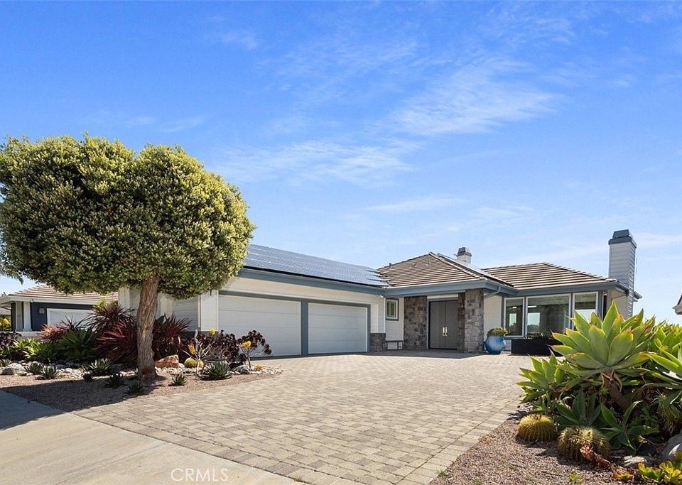 The main floor offers spacious living and dining rooms, with a slider leading to a balcony overlooking both ocean and hillside, as well as the idyllic neighborhood itself. Also on the main floor is a powder room, a media room with it's own full bath, and a sleek, modern office with a floor-to-ceiling sliding glass door for sunlit privacy. The wide hallway with ample storage space leads to the heart of the home and the truly magnificent kitchen. High-end appliances punctuate this space - a Monogram refrigerator, a Dacor cooktop, Miele double oven/microwave and a Miele dishwasher along with custom Thermofoil cabinets designed to maximize space and a built-in wine refrigerator. The appliance garage allows for an immaculate countertop space; and the kitchen window seat is the ultimate relaxation spot in which to enjoy a gorgeous sunrise, over morning tea. Enjoy the rolling hills and seaside views in the daytime and city lights at night while cooking and entertaining amid the thoughtfully-designed open floor plan. The main floor staircase leads to the lower level, containing three bedrooms, including the primary bedroom with a large walk-in closet, built-ins, and en-suite bath. The luxurious primary bathroom is a destination of its own, with a two-person tub and a large shower. Another full bath and the laundry space are located on the bedroom level. Both the primary suite and guest bedroom allow for access to the architecturally-landscaped and drought friendly succulent garden. All design elements of this gem were conceived with aesthetic and eco-conscious objectives, including a 90-solar-panel feature on the rooftop that has generated enough energy to negate electric bills for over 14 years, and an EV Tesla charger in garage. This home has it all, modern design with class, it's coastal living at its best -- an absolute must-see.