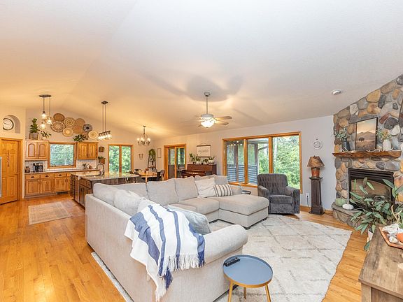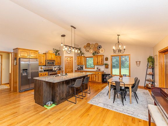 Updated Rambler with brand poleshed sitting on 37.5 fully wooded acres. 36x48 pole shed with 12ft side walls built in 2021. Fully plumbed for in floor heat and power. Brand new roof, siding, garage doors, gutters in April of 2023. Updated kitchen and Granite in 2019. Large living room with vaulted ceilings leading to a 3 season porch. Main floor laundry, large pantry, over sized island. Large master bedroom with private bath and walk in closet. New in lower level in 2021, walk up bar with large family room. Hunt right out your back door.