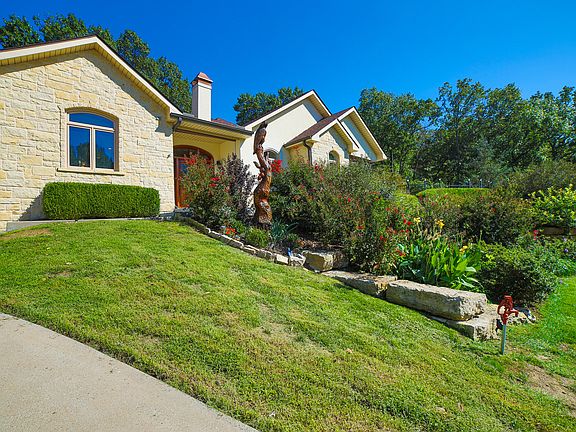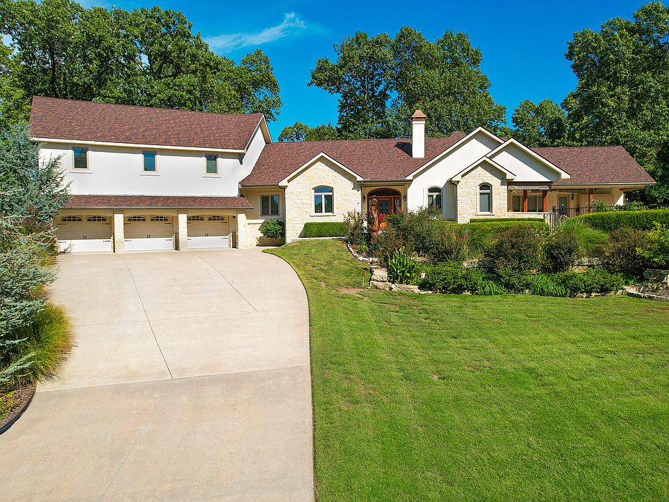 Enter through the leaded glass front door into this magnificent 5 bedroom 4 and 1/2 bath hilltop home located in Buffalo Shores South with a seasonal water view per the owner. The primary suite has an extremely large walk in closet and access out to the heated pool and covered brick patio. Home has 2 bedrooms with ensuite down stairs and 3 bedrooms and 2 baths upstairs. Many amenities of this home include 2 living areas and 2 dining areas, 8 foot doors down stairs, zoned heat and air, tankless water heater, 2 fireplaces 1 gas and 1 electric, a large chef's kitchen with pantry, wet bar with wine fridge, safe room, central vac, etc. large 3 car garage has an oversized bay and a man cave/workout room that's climate controlled. Next to the garage is a pad for an RV/boat with hookups