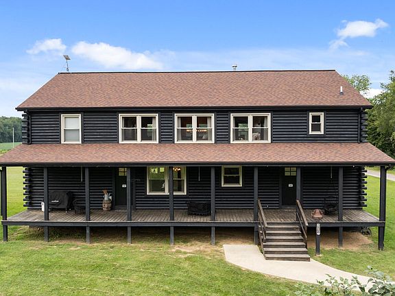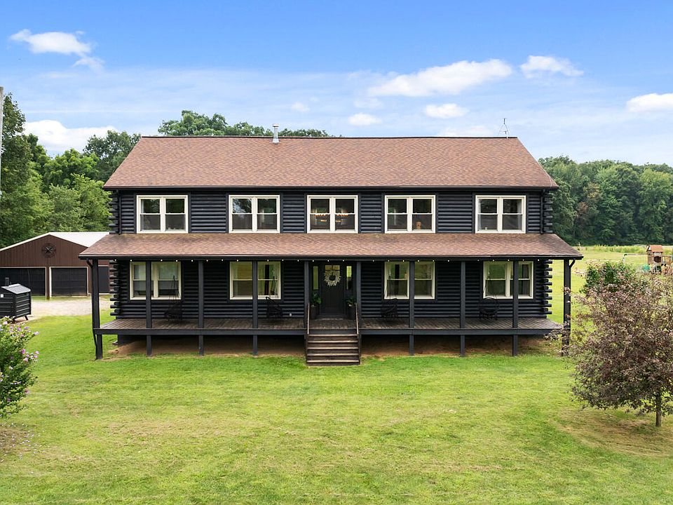 5BR/3BA Americana Log home on 5 acres in Leslie! An amazing kitchen with island and brushed titanium granite counters is open to living room and dining area. Grab a cup of coffee from the coffee bar and enjoy a seat on the covered back porch soaking in the peace and quiet. Living room offers gas fireplace keeping your rooms nice and toasty. Spacious primary ensuite with dual vanities, shower, walk in closet and linen closet. Large main-floor office could be used as a bedroom, another full bath as well as laundry room also on the main floor. Enjoy family movie night in the family room up in the loft. Upstairs, you'll also find 3 more bedrooms with plenty of storage and a full bathroom with tub/shower. New bedroom with egress window in basement, doggy bedroom nook understairs, and the remainder of basement could be finished for even more space. Pole Barn has electricity and a pass-through door through back. Whole house humidifier and dehumidifier. See agent remarks & associated docs for LIST of Updates & Survey.