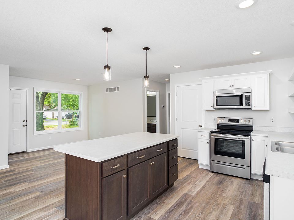 - Kitchen/Features: Garbage Disposal, Island, Cabinets-Wood, Counter-Laminate, Range-Electric