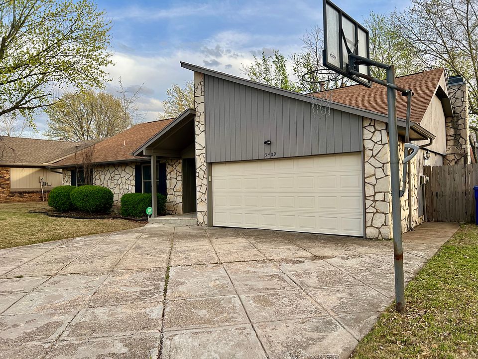 This delightful 3-bedroom, 2-bathroom home is ready to welcome you! The backyard offers stunning nature views, while the interior boasts earthy tones and fresh updates that create a calm, inviting atmosphere. With a 2-car garage and a 3-car driveway, parking is never a hassle. Bonus features include a storage shed and a built-in office in the garage! Located in S BA/Tulsa area, this charming home is full of personality and practicality. Owner/Agent Tenant pays utility and maintains landscaping