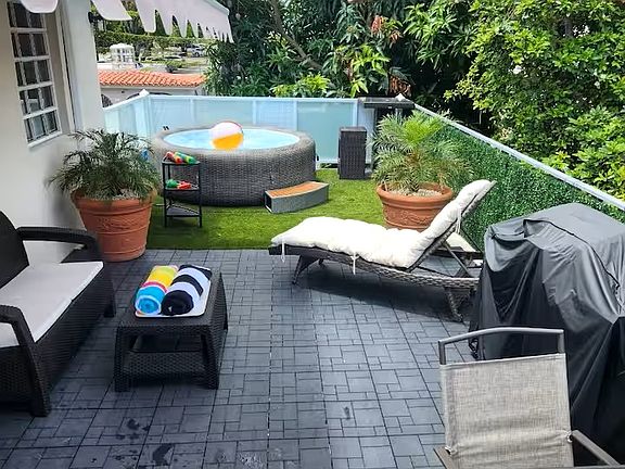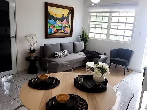 This Second (2nd) floor house will give your family and or friends a vacation-style place with the luxury of a rooftop on a beautiful private terrace. FULLY EQUIPPED AND FURNISHED. Fancy 3 bedrooms- 2 bathrooms house, close to everything in San Juan. Perfect location in a quiet neighborhood in San Juan, near the PR Medical Center and the Highway. Enjoy the city with the luxury of a Jacuzzi on a 2nd floor Terrace; a King master suite plus 2 beautiful rooms w A/C; a separate laundry room with washer/dryer and the comfort of 6 beds with perfect beddings. Everything is included. The location is Superb, near the Highway; the Airport and Old SJ are only 15 minutes away. 10-15 Minutes to Beaches, Condado, Placita, and Isla Verde. El Yunque Rainforest 30-40 min; 6 min to Plaza las Americas Mall. Near Metro station, restaurants, cafeterias. Convenient 2 private pkg spaces are provided. Inside the house, you will enjoy a fully equipped kitchen with stunning New cabinets with quartz countertops, perfect for cooking and dining every day. Pots, pans, bowls, mixers, toaster, coffee maker, blender, "tostones" smasher, pilon, and more are provided for your convenience. Even the dinner and silverware. The 3 rooms are well decorated and have A/C, linens, and bedding for your comfort in peaceful surroundings. It has a perfect-sized master suite with a king bed, a chair bed, and walking closets in the master and other bedrooms. The master has a 65" TV, the living room has a 55" TV and the fun room has a 43" TV. It has a 2nd bedroom with a queen size bed; a 3rd bedroom with a full-twin bunk bed and a full-size sofa bed in the living room. All rooms have dressers and big closets. Water, internet, and monthly pest control are included. Last month's rent is due at signing.