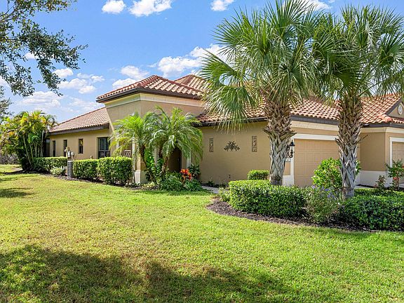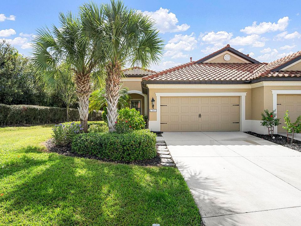 GORGEOUS 2 BEDROOM, 2 BATHROOM WITH A LARGE DEN AND 2 CAR GARAGE VILLA WITH A BEAUTIFUL LAKE VIEW LOCATED IN THE HIGHLY SOUGHT AFTER GATED MILANO COMMUNITY WITH AMAZING UPGRADES. When you walk in you will love the light, bright and open feeling you get. The large den is the perfect place to make a play room or office space. The kitchen is a chefs dream with stone counter tops, updated stainless steel appliances and a huge island. In the primary bedroom suite, you will find plenty of space for a king size bed and a walk-in closet that comes with all of the built-ins you will ever need. The primary en-suite bathroom comes with an updated walk-in shower. The second bedroom also offers plenty of space and a big closet. You will find your second bathroom located right next to the second bedroom along with your inside washer and dryer closet. The living room features beautiful tray ceilings, large windows and sliding glass doors that let in all of the natural light and lead out to your private extended back screened in lanai. The lanai is a great place to sit back, relax and enjoy your morning coffee as you look over the lake, while watching all of the wild life play. All of this is located in the beautiful gated Milano community. Milano features a heated community pool and spa, bocce ball courts, pickleball courts and a large and small dog park. Call today for your private showing. This one will not last long!