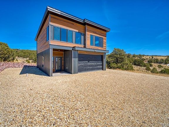 This newer, contemporary home built in 2020 on 5.65 acres in the Cuerno Verde Pines subdivision is looking for new owners! Creatively built to capture wide, vivid views of the Sangre de Cristo mountain range, this two-story home is comfortable and cozy. Walking in the front door, you'll enter a nicely lit, good-sized foyer, with a staircase to your left and a door in front of you to the 2-car oversized garage with amply sized workbench and utility closet. Park outside, or pull in the garage, both have easy access to the home. Walking up the staircase to the 2nd level living area, you're greeted with an open-concept kitchen, dining, and living room. Off the dining area, a small square hallway houses the stackable washer and dryer and provides entry to a 3/4 bath with an oversized shower and guest bedroom. This section of the home provides privacy with the ability to close the sliding barn door at the hallway entry. The primary bedroom is located on the south end of the home with an ensuite 3/4 bath, walk-in closet, and those peacefully invigorating views of the mountains! Cozy up, watch the fire burn in the wood-burning fireplace, and as an added bonus? Central air in the summer!
