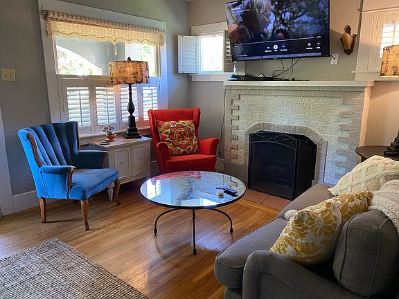 Furnished rental, utilities paid by landlord. 1927 Craftsman, charm intact, in the coveted Ridgway Historic District. This 2 bed/1 bath home boasts fabulous original details and offers the best of both worlds; a wonderful neighborhood feel and quick access to urban amenities --restaurants, coffee, cocktails, shopping, schools, parks and entertainment all within half a mile. Traditional covered front porch, hardwood floors, fireplace in the living room and beautiful built-in hutch in the formal dining room. The kitchen is bright and spacious and features a vintage gas range. Both bedrooms have hardwood floors and connect to a Jack and Jill'' bathroom. Landscaped front and back yard with a covered paver patio in the back for easy entertaining. Other amenities include a newer roof and one car garage. No smoking allowed. Up to 2 pets allowed. Security deposit, first and last month's rent. House is furnished and utilities are included in rent. There are solar panels on the roof and an electric car charger.