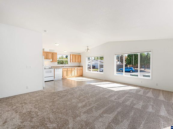 Welcome to easy living! This move-in ready, single-level home sits on a quiet cul-de-sac with a brand new roof and offers a comfortable, low-maintenance lifestyle on land you own. Inside, the great room layout with vaulted ceilings creates an open and airy feel, blending the living, dining, and kitchen areas seamlessly. The kitchen features classic oak cabinets with plenty of storage, and all appliances—including a brand new washer and dryer—are included. The home offers two bedrooms and two full bathrooms.