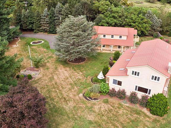 Huge reduction. Owners motivated to sell. Get in before the Holidays and enjoy this unique home. Unusual home for the buyer with additional needs to house their Au Par, adult children or in laws. Amazing home on over an acre lot. Colonial home set back on a park like setting with lush landscaping. Detached carriage style garage, being used as storage and workshop space, also has a home/office in back side of garage with a separate entrance. In addition the garage has a two studio rooms that homeowners can use as art, crafts, yoga, exercise, game room or additional work space. The home has recently been remodeled to include all new stucco on both structures. Brazilian wide plank hardwood floors thru out living and dining room. Dining room has a lighted area under the open staircase for a desk. The front entrance room is an all purpose space. Use your imagination. View virtual staging photos for ideas. The Gourmet kitchen comes with a brand new Thor commercial, 6 gas burner plus griddle stove. All stainless steel appliances included. Vaulted ceilings, skylights give a light airy feel while your baking on the bakers counter. Plenty of cabinets, granite breakfast island, and a walk in pantry. Recently painted thru out home. Main bath upstairs completely remodeled with new updated vanity, custom tile bath, flooring and light fixture. Bedrooms are of generous size, plenty of closet space and one bedroom has a private bath, nice for guests. Laundry rm/half bath located conveniently off kitchen recently updated. Easy access to expansive deck off kitchen. The front entrance room is lovely space for a sitting area, use your imagination. The living rm has a nice picture window that overlooks the lush landscape yard. Views of yard from every window as well as the front wrap around deck. Cozy corner blue ceramic wood stove, sits on white washed brick, for those cold winter nights. Dining rm opens to living rm for easy entertaining. The home is conveniently located near transportation, easy access to Rt. 130 & highways. Airport and train station close by. Robbinsville town park across street which has a playground, walking/jogging paths, soccer fields, lacrosse fields and is home to the Robbinsville Soccer Association and Lacrosse Associations. Robbinsville school system. Country feel with in minutes to shops and restaurants. Unique home, a must see to appreciate! Looking for work at home space or home business, this home is for you. Parking for plenty of cars, truck or motor home.