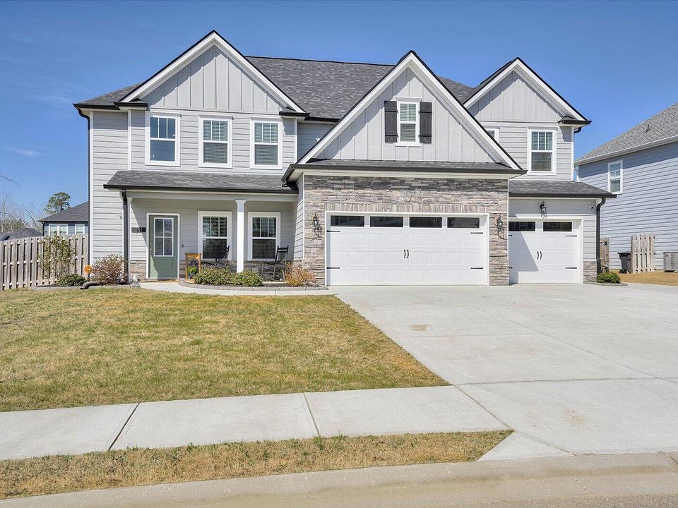 This stunning home is a must-see, featuring a spacious open-concept design ideal for both family gatherings and entertaining guests. The great room seamlessly opens to the gourmet kitchen and formal dining area, creating a welcoming flow perfect for any occasion. With 5 generously-sized bedrooms and 4 full bathrooms, there's plenty of room for everyone. Enjoy outdoor living with a charming front porch and rear porch with a wood-burning fireplace. Connections are available to install a TV over the fireplace. The property also includes a 3-car garage, a fully fenced backyard for added privacy, and a convenient drive-through gate leading to an additional concrete pad in the rear yard. Additional concrete pad parking space offered adjacent to the garage.