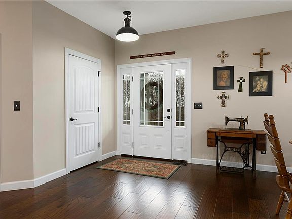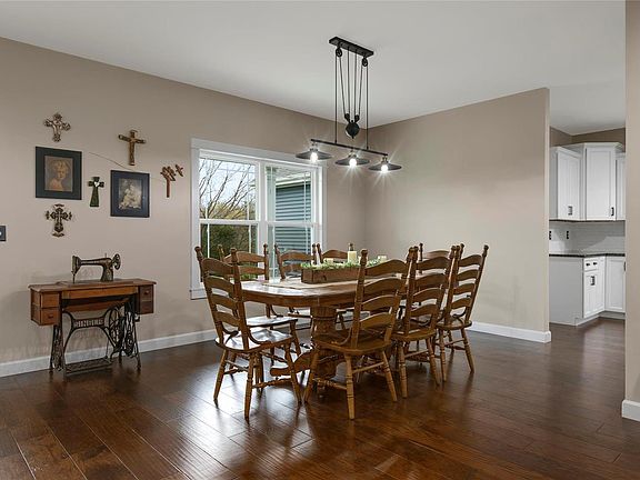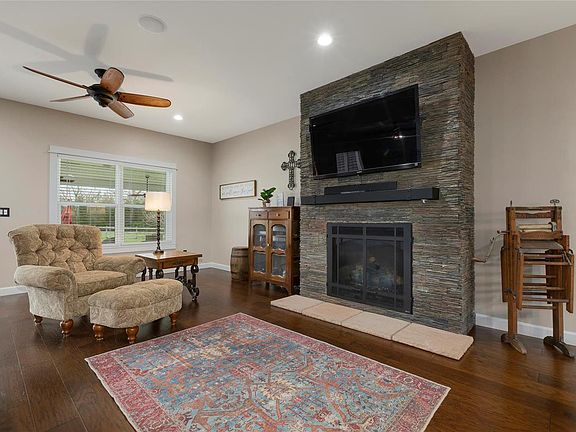 Stunning 6 year old custom built ranch home on 6 acres including a gorgeous barn/outbuilding with horse stall and room for more! Enjoy your time relaxing on the expansive outdoor covered patio overlooking the fenced pasture and gorgeous natural vistas. This perfectly planned home is great for entertaining with its open floor plan and expansive Chef's kitchen with walk-in pantry. The split floorplan has a wonderful primary suite with dual sinks, shower, claw-foot tub, and large walk-in closet. The opposite side of the home has 2 additional bedrooms and full hall bathroom. There is a powder room off the kitchen and generous laundry room as you head to the oversized garage. There are 2 sets of stairs leading to the lower level, either off the kitchen or directly from the garage. The 9' pour lower level currently has a partially finished workshop with built-in cabinets and lighting, egress window and partial rough-in. Your paradise awaits! Horses and chickens welcome!
