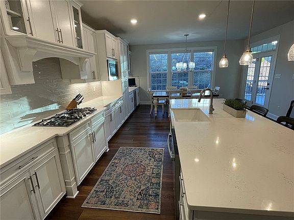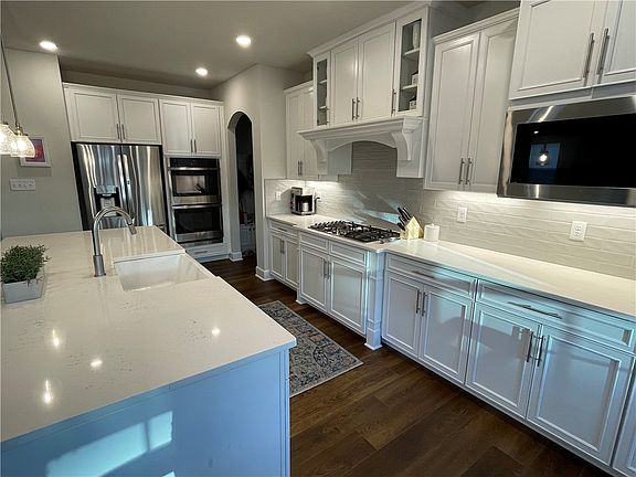 Meticulous Heartland Landon home offers a harmonious blend of comfort, style, and functionality. Gourmet kitchen with under cabinet lighting, stainless appliances, farmhouse ceramic sink, subway tile backsplash, granite countertops. Ample cabinets with slide out shelves, wine fridge in naturally lit dining area, large rear covered deck overlooking low maintenance yard. Office, mudroom, powder room tucked behind kitchen, easy access to three car garage, single bay equipped with 240v line for EV charging. Raised hearth gas fireplace is focal point for great room and kitchen. Two vanities, free standing tub, glass surrounding ceramic shower, water closet in owners bathroom. All bedrooms and closets are spacious throughout, upper level laundry for easy access, finished lower level with wet bar, exercise room, full bath, additional living space and tons of walk in storage. Never had pets in this home. Neutral cabinets, satin nickel hardware and many upgrades all located in Peters Twp SD.