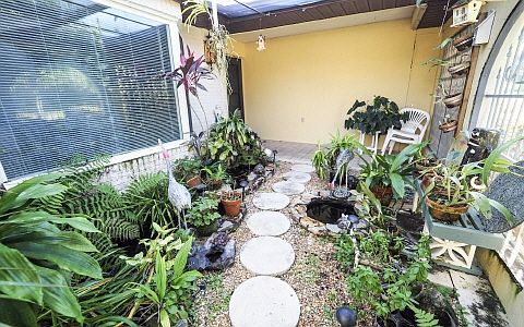 Sprawling home boasting 2200 sqft of living space under air. 3 Bedrooms, split floor plan. Front living room with bay window. Large spacious kitchen with breakfast bar overlooking the dining room and a pass through window to the huge family room. Entryway, dining room and huge family room all have newer wood laminate flooring. Master bedroom is large and will accommodate large bedroom furniture. Lots of closet space and private bath with his and her sinks. Over-sized screen room overlooking the fenced backyard as well as the side yard (big corner lot). Attached 2 car garage has a screen door on it as well. Private enclosed entry features lush foliage and relaxing Koi pond. Big fenced in corner lot with garden area, have your own vegetable garden. Banana and mango trees.