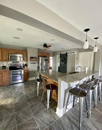 - Kit Dscrp: Dining Area, Countertops - Stone/Granite/Solid, Breakfast Bar / Nook, Kitchen Island, Stainless Steel Appliances, Open Floor Plan, Flooring - Laminate, Remodeled, Wood / Coal / Pellet Stove, Bathroom - Full, Vestibule