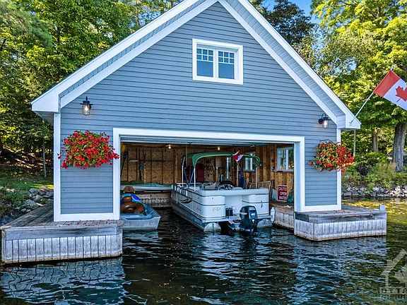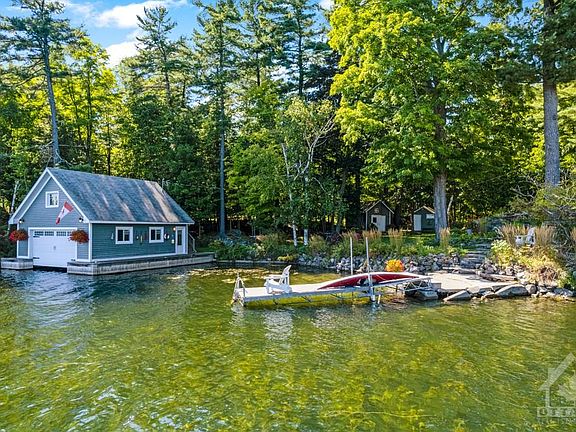 Sunrises, loons, swans and cranes - all part of lovely treed acre on Otty Lake with 262' waterfront. Three-storey home full of endearing character. Plus, boathouse with 2 boat slips and 60amp workshop. Vaulted front foyer opens to second foyer with wall of closets. Livingroom features showstopper floor-to-ceiling fireplace. Formal diningroom. Garden doors to 3-season sunroom. Designed for lake views, kitchen offers pantry cupboards, wrap-about breakfast bar and causal dining. Familyroom stunning floor-to-ceiling fireplace of azure, quartz and granite. Sunny sitting room. Laundry & mud rooms. Second level office/den, 4 comfortable bedrooms and 4-pc bathroom. Third floor primary retreat with 14' ceiling, walk-in closet, luxury 5-pc ensuite, wall of windows over lake and your own balcony. Two decks, hot tub included. Two garden sheds with hydro. End of dock 7' deep into clear waters. Curbside garbage pickup. Hi-speed. Cell service. Private road grading & plowing $390/2022. 5 mins Perth.