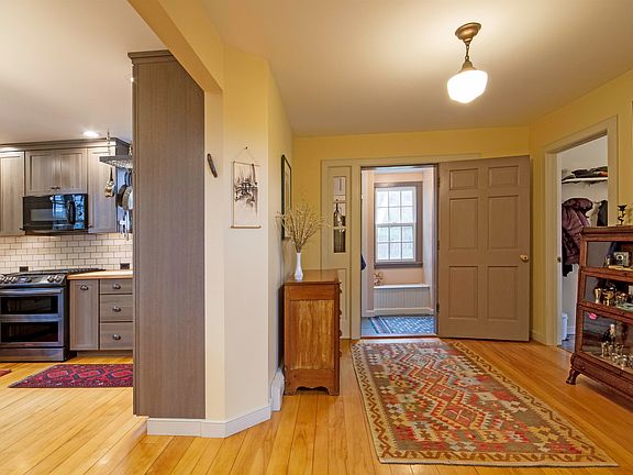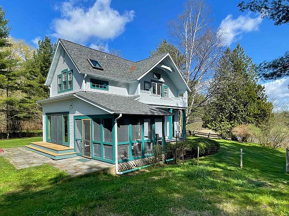 Quality of construction is evident in this architecturally-designed 4BR, 2.5BA cape in Monkton. Sited on 20 acres with mountain views and the beautiful natural scenery of Pond Brook, one will enjoy the flora and fauna that surrounds this home site. Enter via the covered front porch into the mudroom leading you into the main foyer. To the left is a laundry room and a cozy den, and the remodeled kitchen with custom cabinetry and granite/butcher block counters is on the right. Maple flooring grounds the main living spaces and flows to the open living/dining area warmed by a wood stove. An enclosed porch and covered deck allow direct access to the partially fenced-in back yard and hot tub. Before you head to the second floor, notice the cute half bath tucked under the stairs. The primary bedroom sits to the East, perfect for enjoying sunrise overlooking the wetlands from the private balcony. It also includes a spacious spa-like 4 piece ensuite with a skylight over the soaking tub. 3 more BRs and another 4 piece BA complete this level. Extra features throughout include 6 panel doors, 6 over 6 Marvin Ultimate windows with storms, custom blinds, invisible fence for furry friends, new septic system, and more. Detached from the home, the 2 car garage includes a finished room perfect for a hobby space PLUS a lovely second floor guest space with vaulted ceilings, pine flooring, bedroom, bath with a clawfoot tub, and kitchen. This property is a must see!