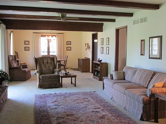 Spacious brick ranch on cul-de-sac lot with mature trees. Tile entry. Formal living room with picture window. Main floor family room with beamed ceilings, brick fireplace (wood burning with heatalator) & double sliding doors leading out to patio. Fully applianced kitchen with pantry & large eating space. Main floor laundry. Master bedroom includes double closets & master bath with tub/shower. Full partially finished basement features a large rec room (unfinished ceiling) & several unfinished rooms partitioned off for finishing currently being used now for storage areas with built in shelving & workbench. 2 car garage w/opener, sprinklers, patio, wood fence. Following Estate Sale in May old carpeting will be removed to uncover Fabulous hardwood floors in Family Room, Dining room & 3 bedrooms! All info deemed reliable but not guaranteed.