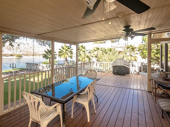 Enjoy sunny and warm Arizona in this beautiful furnished riverfront home with dock and mountain views this winter! This house has everything you need for your visit! Great for snowbirds! Large deck and treed grass yard overlooking the Colorado River. Water softener and grab bars in bathrooms and showers. Reverse osmosis system for drinking water. This is a very comfortable home located in an area with so much to offer. Casinos, hiking, boating ,fishing and kayaking to name a few.