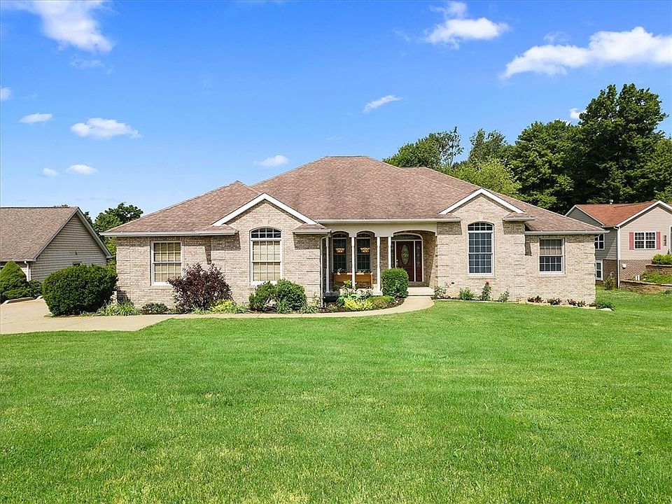 Situated on a 1+ acre lot, high-end craftsmanship abounds in this custom ranch home. All-brick exterior, Anderson Windows, hardwood flooring/doors/trim throughout. The eat-in kitchen boasts custom Amish cabinetry, central island, two sinks, gas stove and two pantries. The living room features a wall of windows overlooking the expansive rear yard. Master suite is equipped with dual sinks, stand-in shower, jet tub and 10'x7' walk-in closet. Laundry is conveniently located between the three main level bedrooms. Down the circular staircase to the basement, where the 4th bedroom, 3rd bathroom, game room and bonus room await. Basement is a walk-out with windows all along the rear wall. Access the 30'x14' deck from the kitchen and the covered patio from the basement. The lot is over an acre, partly fenced and perfect for a pool. Level driveway and oversized three-car garage. Central vacuum system, high-efficiency furnace and large 73-gallon water tank. This unique, custom beauty is waiting.