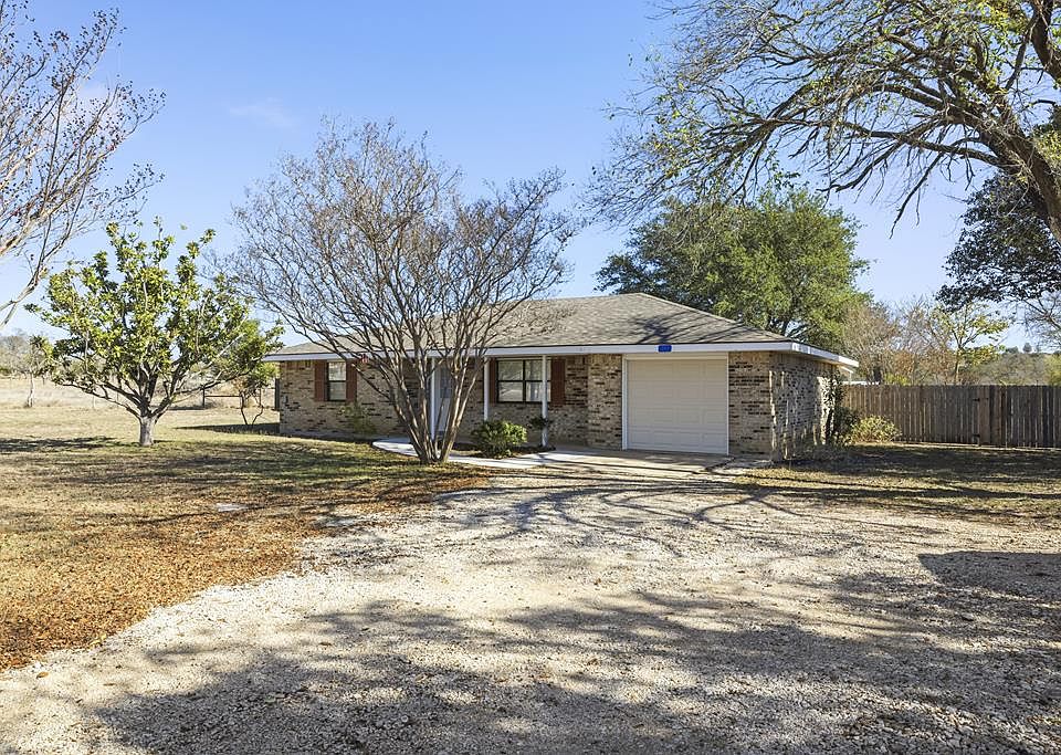 Beautifully renovated, this charming two-bedroom, one-bath home features a classic all-brick exterior and sits on five level acres with endless possibilities. Interior updates include new flooring, fresh paint throughout, and granite countertops. The kitchen offers abundant white cabinetry, a convenient eat-at bar, and brand-new appliances, including a stove and dishwasher. The bathroom has also been beautifully refreshed with granite countertops, a double vanity, a new toilet, an updated bathtub, and new flooring. The home features a welcoming covered front porch, along with a spacious covered porch at the back—perfect for relaxing or entertaining. Thoughtfully positioned on the southwest corner of the property, the home leaves ample space for additional structures or future improvements. The acreage is fully fenced and cross-fenced—ideal for animals to roam freely—and is accented by a variety of mature trees that provide generous shade around the homesite.