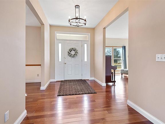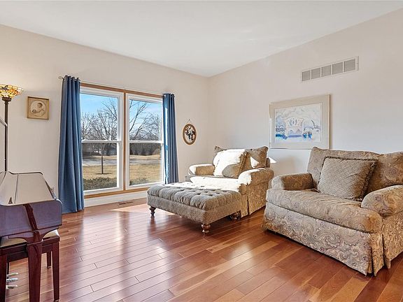 Inviting 1.5-story home on a corner lot features a 3-car garage, 2 bedrooms on the main flr, 2 bedrooms upstairs w/ a loft area & full bath. The great room boasts a full brick gas fireplace, built-in bookcase & cathedral ceiling. The gorgeous hardwood flring flows primarily throughout the house, complemented by 9ft ceilings on the main flr. As you enter the home, the living room & dining room flank the spacious foyer. The dining room offers a tray ceiling & custom millwork. The updated kitchen includes stainless appliances, gas cooktop, wall oven, center island, tile flooring & pantry. Plenty of storage in the kitchen. Add’l amenities comprise main flr laundry & central vacuum system. The primary suite includes a bay window & en suite w/ tile flooring, dual sinks, a separate shower & whirlpool tub. The walk-out lower-level w/ a 9ft pour, brick fireplace, rough-in for a bath awaits your design. Two expansive decks overlooking the over 2/3-acre lot complete this delightful spacious home.