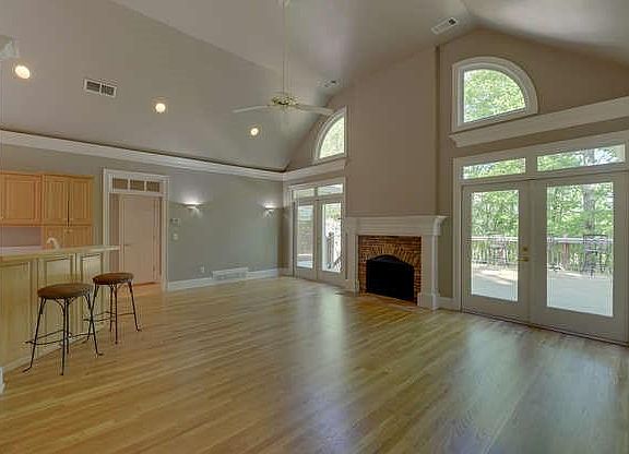 This charming lakefront home offers hardwood floors, split BR plan, & master on main. It has 2 stone fireplaces, 2 car garage, open floor plan with cathedral ceilings. Open double french doors, onto large deck overlooking Lake. Deck also accessible from master BR. Gentle walk to single slip party dock in secluded cove Power installed at dock! 2 jet ski ports are included. Sit on the dock watching beautiful sunsets. Home is in an upscale lake community, & public boat ramp is only minutes away. Home is well maintained, move in ready! Call today for showing!
